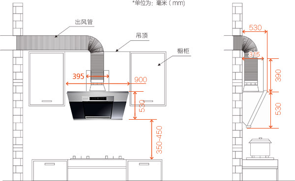 2、為方便煙機安裝,櫥柜需預(yù)留一定空間,在產(chǎn)品尺寸的基礎(chǔ)上,建議多預(yù)留30㎜