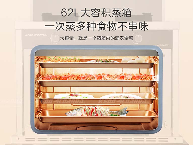 集成灶十大品牌、廚電行業(yè)十大品牌科恩D123X蒸烤消一體集成灶,擁有62L大容積內膽,內部設有多層蒸架,選用進口“薩萊米”陶瓷加熱盤,噴氣式4D立體蒸,噴氣升溫快,能迅速讓蒸汽達到腔內各個區(qū)域,從而實現無冷角均勻加熱,蒸汽快速升騰,縮短了加熱的時間,鎖住了營養(yǎng),實現食物的原汁原味,使烹飪更加鮮美!