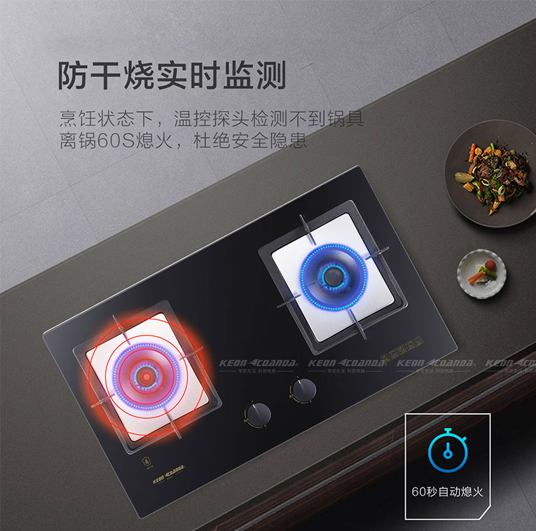 另外,大多數(shù)家在購(gòu)買(mǎi)廚電的時(shí)候順手買(mǎi)個(gè)燃?xì)庠?,并沒(méi)有專門(mén)的去選購(gòu)一款適合的、安全的燃?xì)庠?。這就導(dǎo)致了一些家庭的廚房安全沒(méi)有辦法得到保障,會(huì)出現(xiàn)燒干鍋、鍋空燃等安全隱患。KN610智能防干燒灶具擁有防干燒裝置功能,左爐頭帶日本進(jìn)口探頭防干燒裝置,意外忘記關(guān)火外出干燒時(shí),將會(huì)自動(dòng)關(guān)火,同時(shí)當(dāng)鍋離開(kāi)60S時(shí)將自動(dòng)熄火,杜絕了安全隱患!