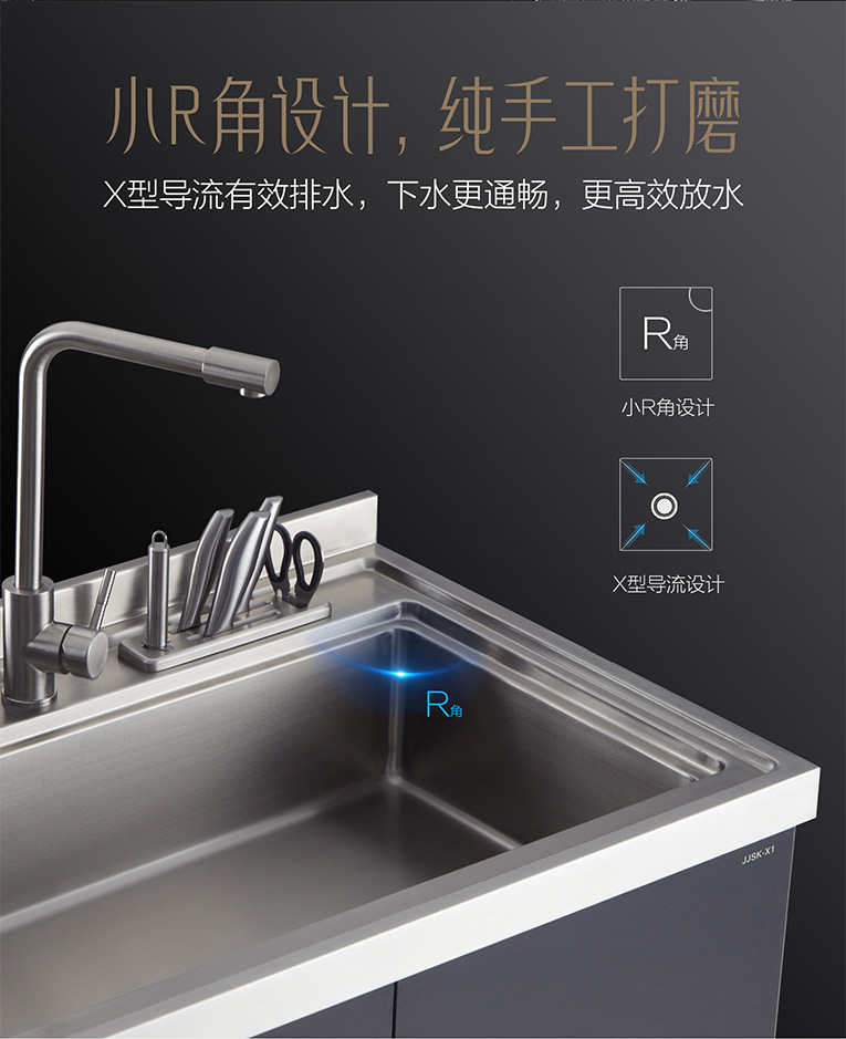 科恩集成凈洗中心,包含了X1(子母槽儲物柜款)、X2(雙槽儲物柜款)、X3(子母槽消毒柜款)、X5(雙槽超聲波消毒柜款)、X6(子母槽洗碗機(jī)十件套)產(chǎn)品。以集成水槽X1為例,堅(jiān)持品質(zhì)選材,手工匠心鑄造,利用先進(jìn)科技打造高端品質(zhì),外觀設(shè)計精巧,折彎手工鑄造,一焊一接美觀大方,完美詮釋高端廚房格調(diào)生活。X1集成水槽集食材、水洗清潔、熱水系統(tǒng)、凈水系統(tǒng)、垃圾處理、收藏儲物為一體,多功能臺面設(shè)計,一切都變得如此的順手,水龍頭采用360°萬向設(shè)計,出水均勻,掌控自如。另外,X1在性能、品質(zhì)上都極為出眾,首先,900mm寬體設(shè)計,大水槽加寬加深,可移動式子水槽,單槽秒變雙槽,有效提高了水槽利用率,增加了廚房收納空間,X型導(dǎo)流流水,搭配小R角設(shè)計,應(yīng)用拉絲工藝,水槽干燥不積水,四條引水線,引導(dǎo)水流輕松下水。