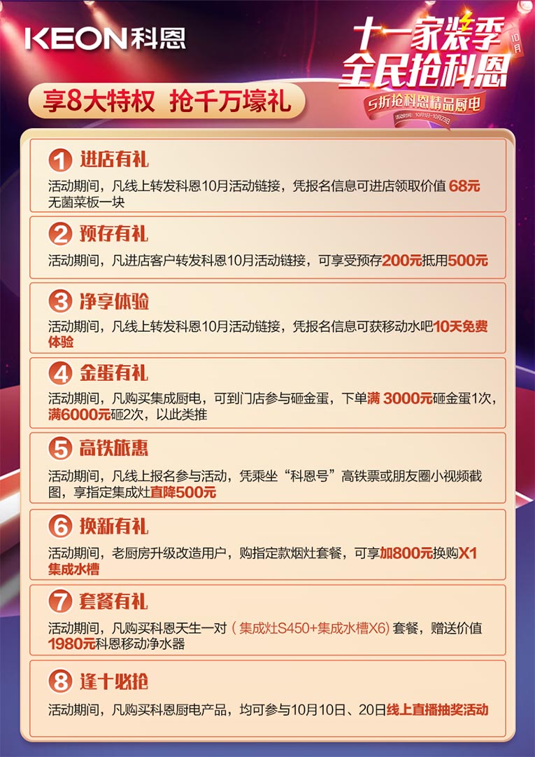除此之外,集成灶十大品牌、廚電行業(yè)十大品牌科恩十一家裝季全民搶科恩,8大特權(quán)壕禮限時(shí)放送,特權(quán)一進(jìn)店有禮:凡線上轉(zhuǎn)發(fā)科恩10月活動(dòng)鏈接,憑報(bào)名信息可進(jìn)店領(lǐng)取價(jià)值68元無菌菜板一塊;特權(quán)二預(yù)存有禮:凡進(jìn)店客戶轉(zhuǎn)發(fā)科恩10月活動(dòng)鏈接,可享受預(yù)存200元抵用500元;特權(quán)三凈享體驗(yàn):活動(dòng)期間,凡線上轉(zhuǎn)發(fā)科恩10月活動(dòng)鏈接,憑報(bào)名信息可獲移動(dòng)水吧10天免費(fèi)體驗(yàn);特權(quán)四金蛋有禮:活動(dòng)期間,凡購買集成廚電,可到門店參與砸金蛋,下單滿3000元砸金蛋1次,滿6000元砸2次,以此類推;特權(quán)五高鐵旅惠:活動(dòng)期間凡線上報(bào)名參與活動(dòng),憑乘坐“科恩號(hào)”高鐵票或朋友圈小視頻截圖,享指定集成灶直降500元;特權(quán)六換新有禮:活動(dòng)期間,老廚房升級(jí)改造,購指定款煙灶套餐,可享加800元換購X1集成水槽;特權(quán)七套餐有禮:活動(dòng)期間,凡購買科恩天生一對(duì)(集成灶S450+集成水槽X6)套餐,贈(zèng)送價(jià)值1980元科恩移動(dòng)凈水器;特權(quán)八逢十必?fù)專夯顒?dòng)期間,凡購買科恩廚電產(chǎn)品,均可參與10月10日、20日線上直播抽獎(jiǎng)活動(dòng)。
