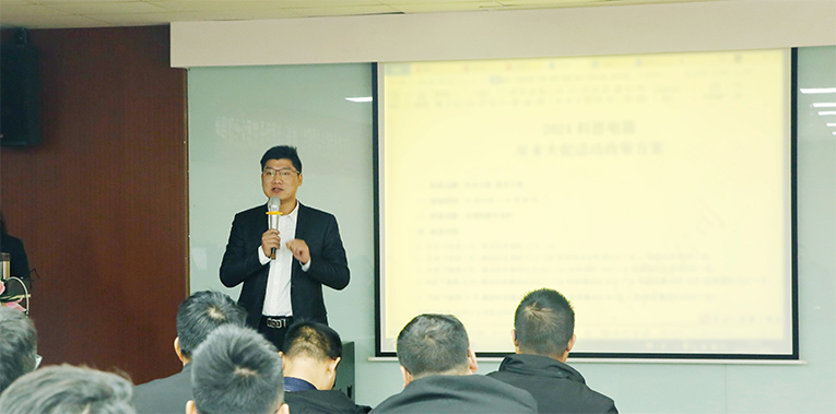 會(huì)議開(kāi)始,科恩集成灶總經(jīng)理趙漢斌上臺(tái)發(fā)言,趙總表示,回顧前三季度的營(yíng)銷工作發(fā)展情況,在全體精英的實(shí)干拼搏下,科恩業(yè)績(jī)逐月提升,這離不開(kāi)公司每一位營(yíng)銷經(jīng)理的辛苦付出。趙總還為步入年底階段提出了下一步工作思路,對(duì)最后沖刺工作進(jìn)行全面部署和具體安排。