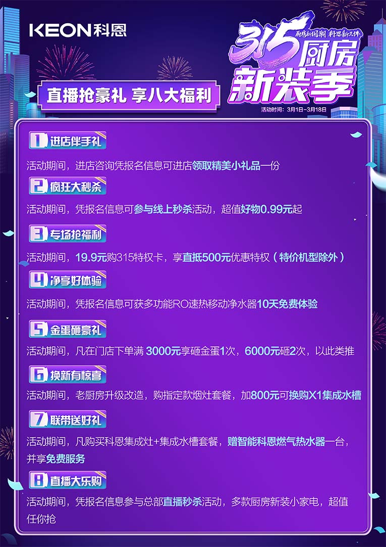 廚房新國潮,科恩新三件~科恩集成灶315廚房新裝季,八大特權(quán)限時(shí)大放送?。∫贿M(jìn)店伴手禮,活動(dòng)期間進(jìn)店資訊憑報(bào)名信息可領(lǐng)取精美小禮品一份;二瘋狂大秒殺,憑報(bào)名信息可參與線上秒殺活動(dòng),超值好物0.99元起;三專場搶福利,活動(dòng)期間19.9元購315特權(quán)卡,享直抵500元特惠特權(quán)(特價(jià)機(jī)芯除外);四凈享好體驗(yàn),活動(dòng)期間憑報(bào)名信息可獲多功能RO速熱移動(dòng)凈水器10天免費(fèi)體驗(yàn);五金蛋砸豪禮,活動(dòng)期間凡在門店下單滿3000元享砸金蛋1次,6000元砸2次,以此類推;六換新有驚喜,活動(dòng)期間老廚房升級(jí)改造,購指定款煙灶套餐,加800元可換購X1集成水槽;七聯(lián)帶送好禮,活動(dòng)期間凡購買科恩集成灶+集成水槽套餐,贈(zèng)智能科恩燃?xì)鉄崴饕慌_(tái),并享免費(fèi)服務(wù);八直播大樂購,活動(dòng)期間憑報(bào)名信息參與總部直播秒殺活動(dòng),多款廚房新裝小家電,超值任你搶!