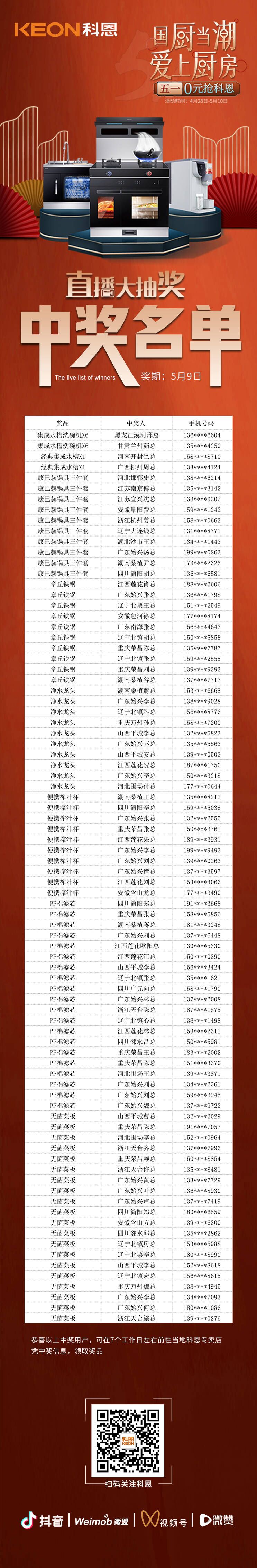 國(guó)廚當(dāng)潮,愛(ài)上廚房——0元搶科恩活動(dòng)正在火爆進(jìn)行中,為回饋消費(fèi)者,科恩電器特于5月9日晚舉行了第二輪直播大抽獎(jiǎng)活動(dòng)。在5日公布了第一輪直播大抽獎(jiǎng)中獎(jiǎng)名單后,小編收到了很多用戶(hù)的后臺(tái)留言,紛紛詢(xún)問(wèn)第二輪大抽獎(jiǎng)的時(shí)間以及參與方式,本次活動(dòng)吸引了眾多消費(fèi)者前來(lái)參與,活動(dòng)精彩紛呈,直播間也熱鬧非凡,全國(guó)各地的朋友們積極參與,用指尖傳遞著國(guó)廚當(dāng)潮,愛(ài)上廚房的精致廚房新理念。