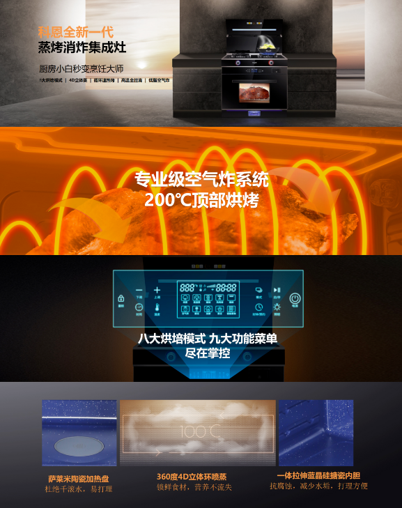 除了在外形上的顛覆常規(guī)、以型造境之外,C系列集成灶在功能實(shí)用上的優(yōu)勢(shì)也可圈可點(diǎn),以C260蒸烤消炸集成灶為例,集鮮蒸、嫩烤、消殺、空氣炸于一體,美味健康四合一。八大烘焙模式、九大功能菜單、4D立體蒸、循環(huán)速熱烤、高溫全腔消、低脂空氣炸,自動(dòng)烹飪,輕松上手,一臺(tái)科恩C260集成灶頂?shù)昧艘粋€(gè)專(zhuān)業(yè)級(jí)烹飪大師,實(shí)在令人心動(dòng)!