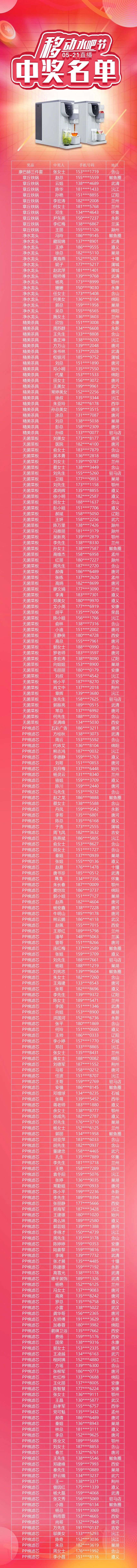 什么?聽說科恩移動水吧節(jié)不僅能15天免費(fèi)體驗(yàn)一臺頂九臺的集成式凈水器,還能參與直播抽獎,而且還是100%中獎,科恩電器也太壕氣了吧!??!科恩移動水吧節(jié),誓讓國人喝好水,全國免費(fèi)體驗(yàn)活動正在火熱進(jìn)行中,重磅政策與誠意豪禮,免費(fèi)體驗(yàn),產(chǎn)品始終如一。為回饋消費(fèi)者,科恩移動水吧節(jié)直播抽獎活動順利舉行,凡參與免費(fèi)體驗(yàn)活動即可抽取獎品,實(shí)力寵粉,100%中獎!抽獎名單公示如下: