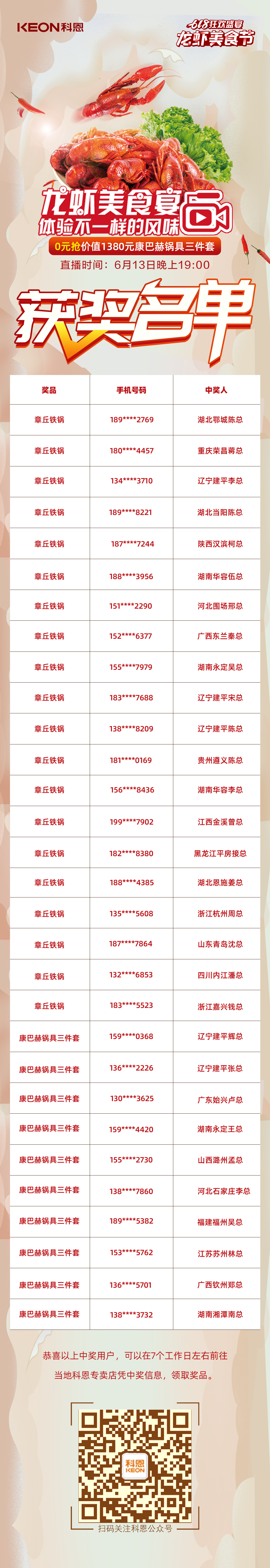 為回饋消費者的支持與厚愛,科恩集成灶實力寵粉,不僅推出線下龍蝦美食宴活動,更有多輪線上大抽獎活動。這么精彩的龍蝦美食節(jié)直播活動,你參與了嗎?1元薅羊毛的機會你搶到了嗎?快來看看這期中獎名單,有你嗎?