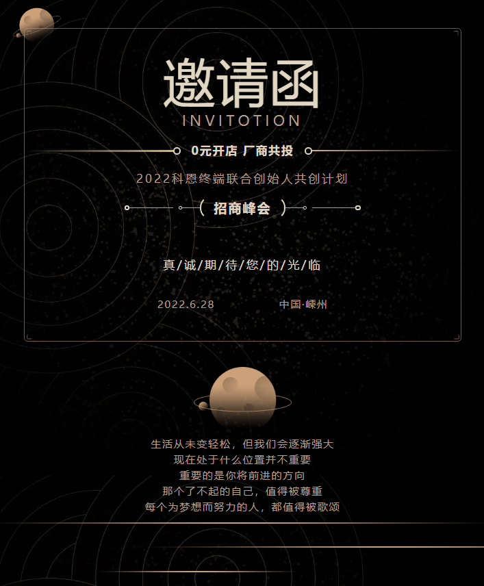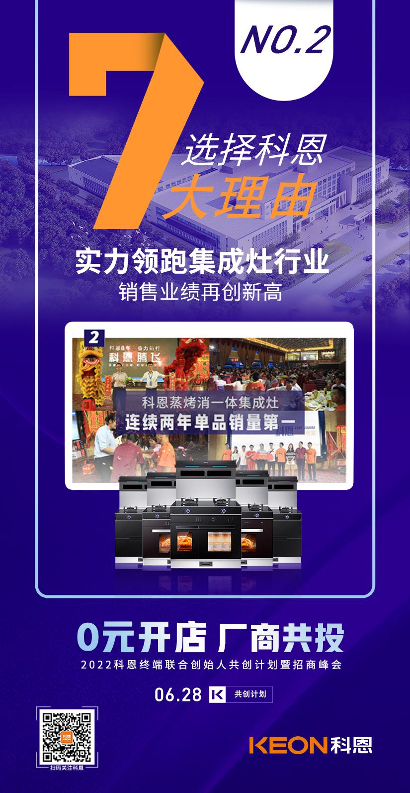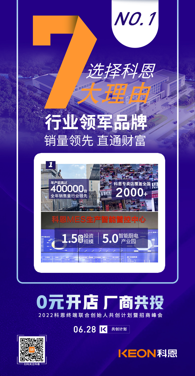 生活從未變輕松,但我們會逐漸強大,現(xiàn)在處于什么位置并不重要,重要的是你將前進的方向,那個了不起的自己,值得被尊重,每個為夢想而努力的人,都值得被歌頌!誠邀您參加2022年6月28日在浙江嵊州,由浙江科恩電器有限公司主辦的「0元開店,廠商共投」2022年科恩終端聯(lián)合創(chuàng)始人共創(chuàng)計劃暨招商峰會,并真誠期望我們于此次活動共享藍海市場商業(yè)機會的同時,商討雙方企業(yè)發(fā)展策略,共同揭開科恩集成灶品牌的神秘面紗。