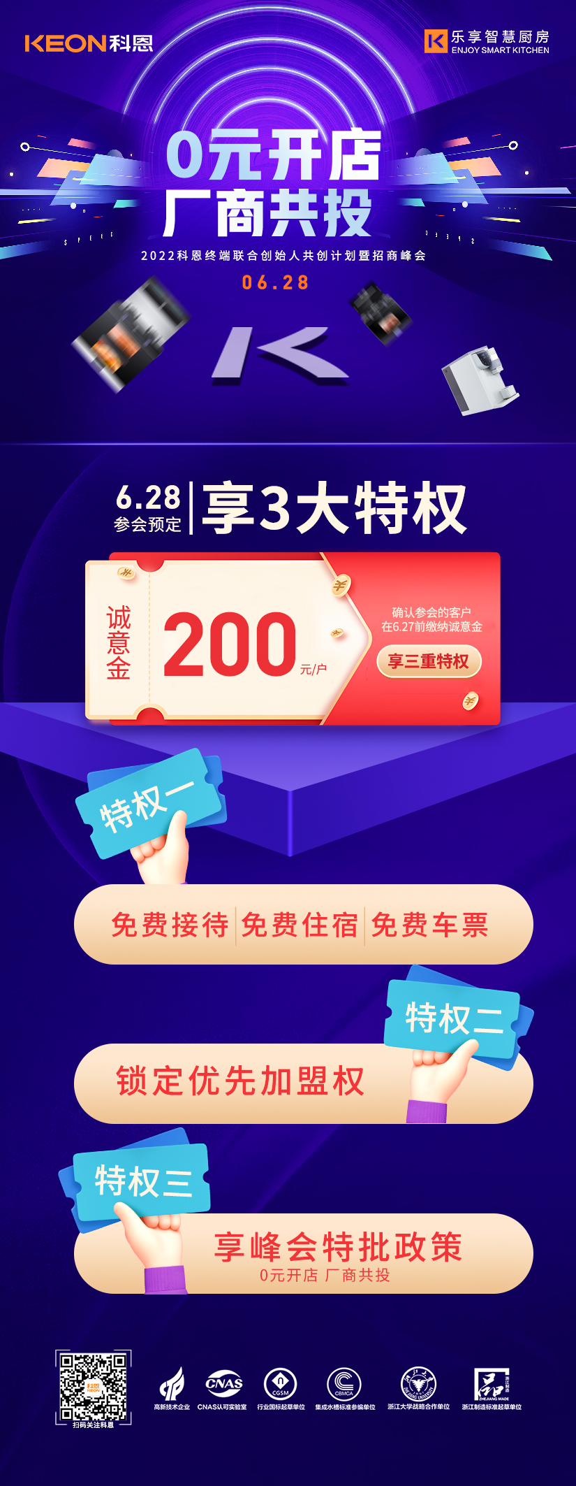 6月28日2022科恩終端聯(lián)合創(chuàng)始人共創(chuàng)計(jì)劃暨招商峰會(huì)將在廚具之都嵊州隆重舉辦,本次峰會(huì)將以“0元開店,廠商共投”為主題,邀請(qǐng)來自全國各地的行業(yè)精英、投資大佬匯聚一堂,共同探討廚電行業(yè)發(fā)展趨勢(shì),解鎖集成灶行業(yè)新賽道趨勢(shì)密碼,多維驗(yàn)證科恩集團(tuán)軟硬厚實(shí)力,屆時(shí),將為各位來賓解讀限時(shí)政策內(nèi)容,為各位投資人提供一個(gè)潛力無限,共創(chuàng)霸業(yè)的優(yōu)秀共創(chuàng)平臺(tái)。