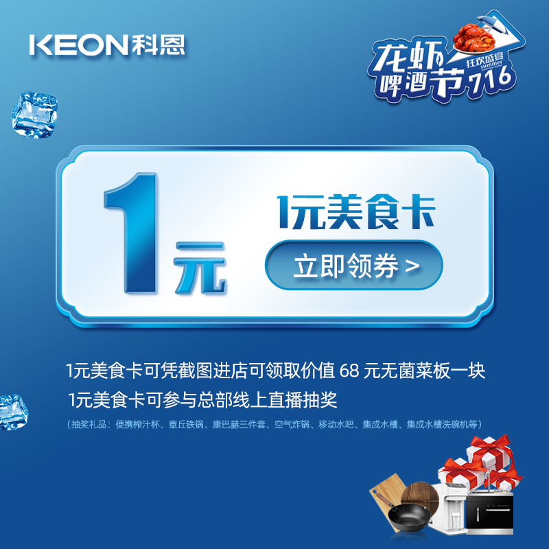 這還不夠,7月16日14點,716直播大抽獎準時開播,活動期間,凡購買1元美食特權(quán)卡用戶不僅可憑截圖進店領(lǐng)取價值68元無菌菜板一塊,還可參與716總部線上直播大抽獎,看直播中大獎,便攜榨汁杯、章丘鐵鍋、康巴赫三件套、空氣炸鍋、移動水吧、集成水槽、集成水槽洗碗機等海量豪禮抽不停!科恩寵你,不講道理!