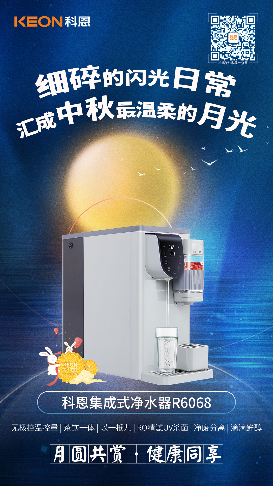 生活是一半人間煙火,一半山河遠(yuǎn)闊,你眺望詩和遠(yuǎn)方,卻也別忘了家的方向,卸下滿身疲憊,拋開城市的車水馬龍,用一臺(tái)科恩集成式凈水器R6068,一杯咖啡一壺清茶一杯溫度適宜的熱水,細(xì)碎的閃光日常,倒?jié)M愛的溫度,匯成中秋最溫暖的月光!