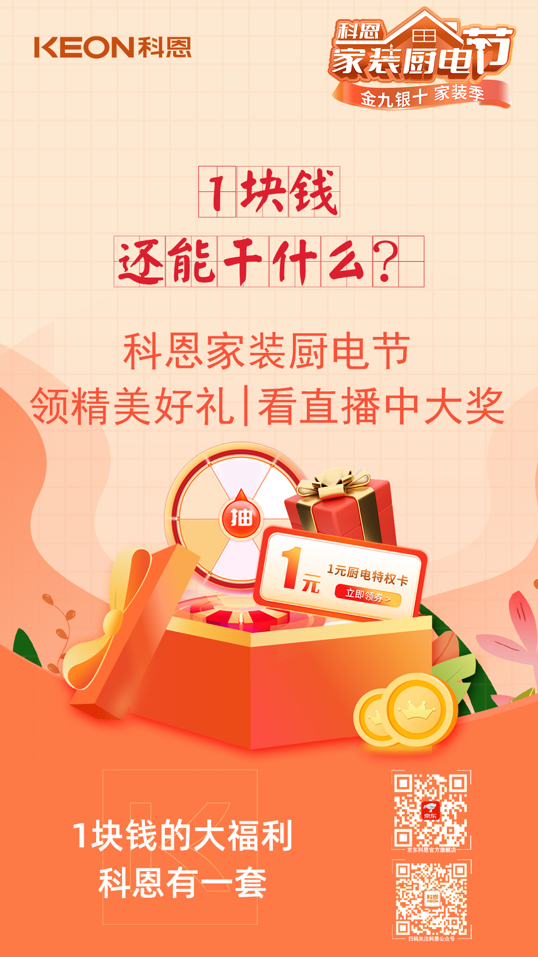 金九銀十家裝季,科恩家裝廚電節(jié),1元特權卡,樂享六喜禮,福利連連,驚喜不斷,趁此機會,用更優(yōu)惠的價格購得稱心如意的廚電好物,年前入住美滋滋!