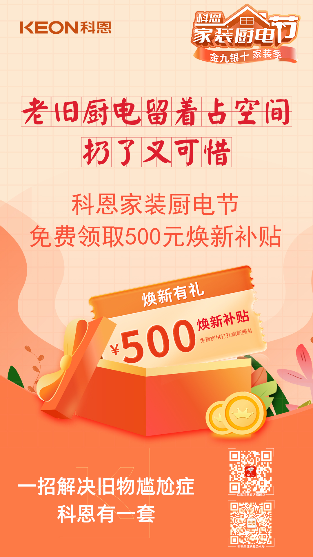 用了好多年的老舊廚電,不僅耗能大,放在家里更顯臟亂差,爸媽不舍得換,留著占空間,扔了又可惜,就這樣將就湊合過了一年又一年,恰逢其時,參與科恩家裝廚電節(jié),免費領取領取超值煥新煥新補貼,告別老舊廚電,開啟美好生活,一招解決舊物尷尬癥,科恩有一套!