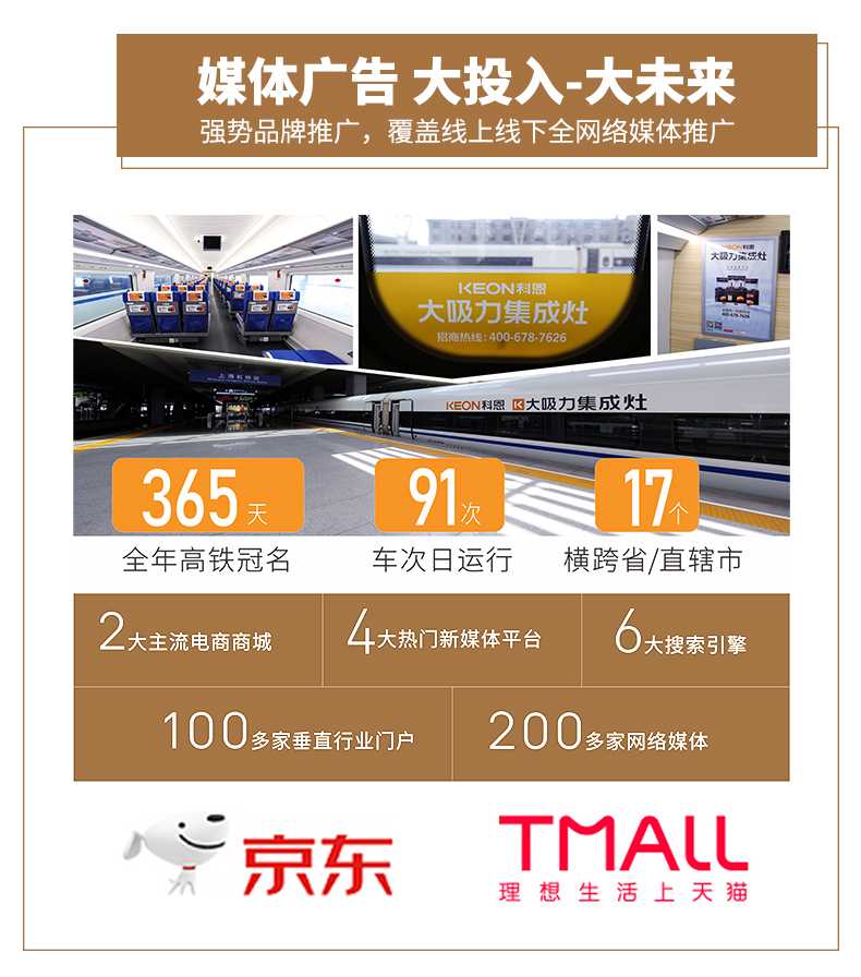 科恩集成灶自2021年以來全力加速品牌推廣進程,大手筆投放高鐵廣告,斥巨資全年冠名——“科恩號”高鐵品牌專列:橫跨17個省/直轄市,日運行91車次,傳播面積之廣,受及群眾之多,在消費者心目中有著極強的影響力和公信力,借助高鐵“國家名片”屬性為品牌權(quán)威背書,讓“集成灶就選科恩大吸力”口號傳遍大江南北!如今,科恩電器再次重磅出擊,攜手嵊新高鐵站,強勢霸屏其黃金廣告C位,精準覆蓋,持續(xù)品牌形象建設(shè),為品牌傳播助力加碼,實力詮釋“科恩速度”!