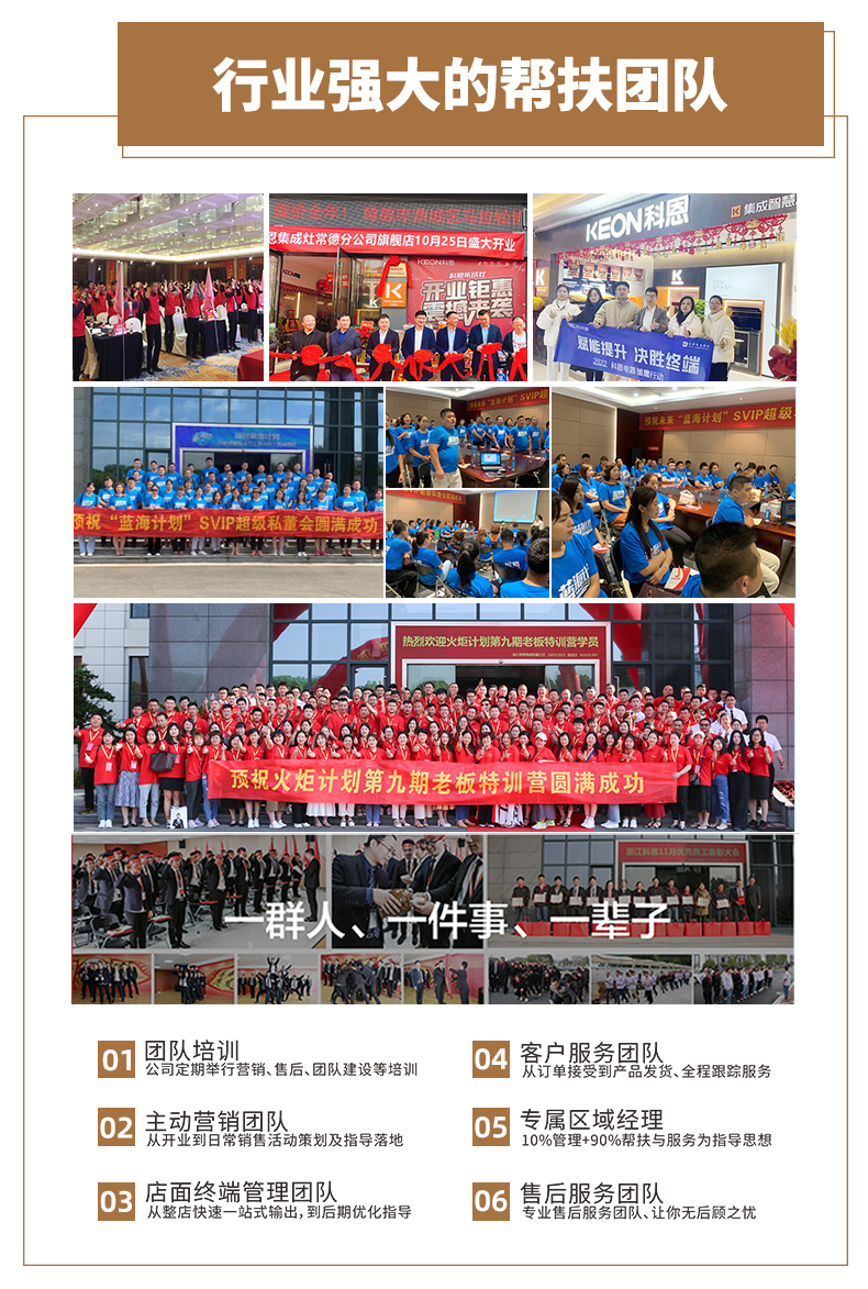 科恩運營中心強商育商團隊始終下沉一線、遍布全國,策劃布局雛鷹行動、總裁簽售會、金牌服務(wù)、龍蝦美食節(jié)、金九銀十家裝節(jié)、開業(yè)活動等終端活動,全方位手把手扶持,為終端提供堅實后盾,實現(xiàn)共創(chuàng)共贏。