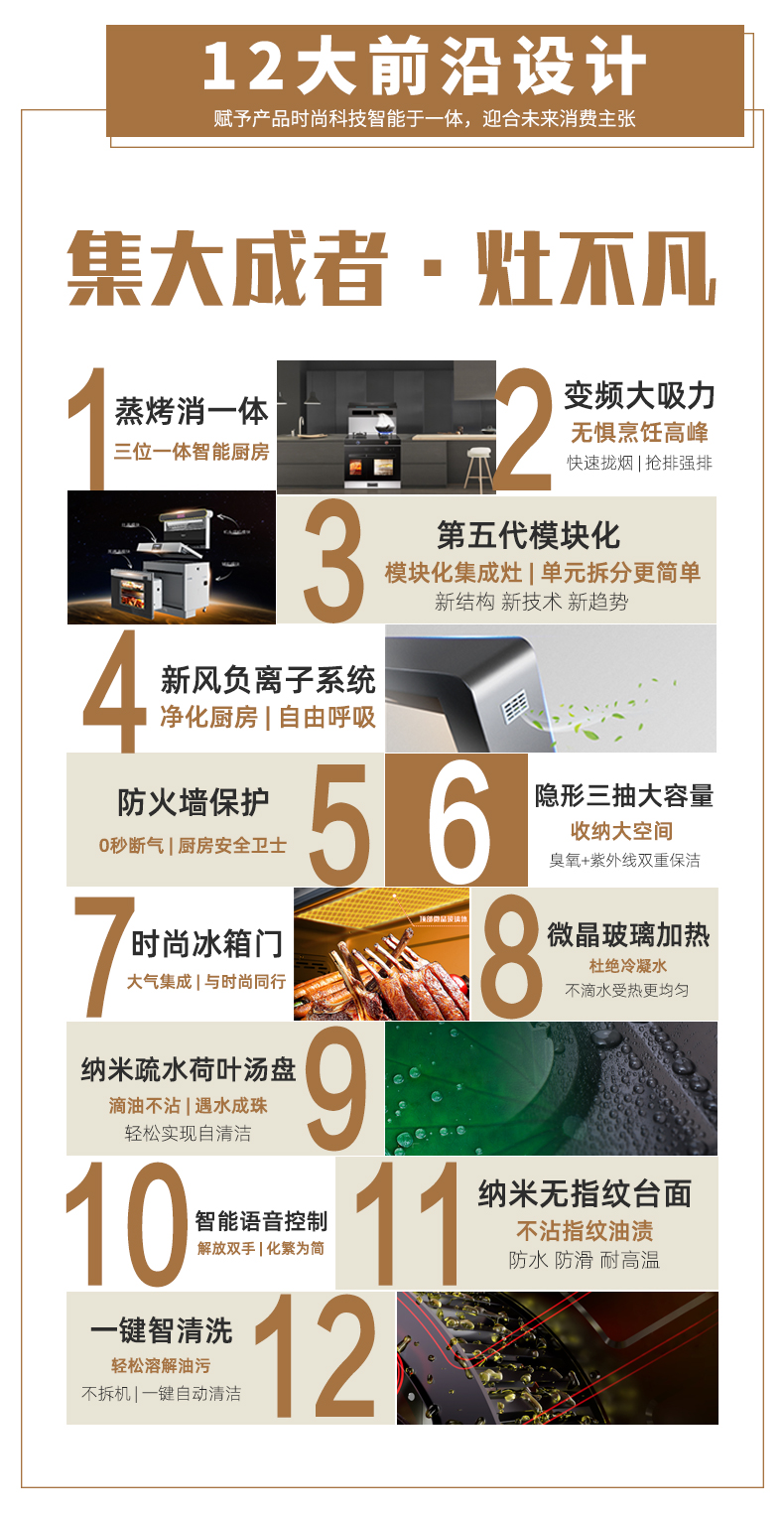 產(chǎn)品好不好,要看用戶的滿意度,科恩集成灶時刻洞察用戶需求變化,在產(chǎn)品研發(fā)上不斷發(fā)力,以變頻大吸力、第五代模塊化、智能語音互聯(lián)、蒸烤消一體、左右蒸烤、微晶玻璃加熱、納米疏水荷葉湯盤、納米無指紋臺面、一鍵智清洗等12大差異化前沿技術(shù),實現(xiàn)多項性能提升突破,為用戶帶去“樂享智慧烹飪”廚房新體驗。