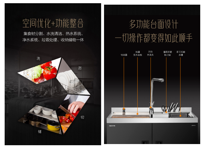 空間優(yōu)化+功能整合,集食材分割、水洗清潔、熱水系統(tǒng)、凈水系統(tǒng)、垃圾處理、收納儲(chǔ)物于一體,多功能臺(tái)面設(shè)計(jì),皂液器、加厚實(shí)木菜板、萬(wàn)向水龍頭、通用不銹鋼刀架、手工打磨水槽等功能,每一處細(xì)節(jié)堪稱完美,整體造型優(yōu)美別致,同時(shí)兼顧實(shí)用性。
