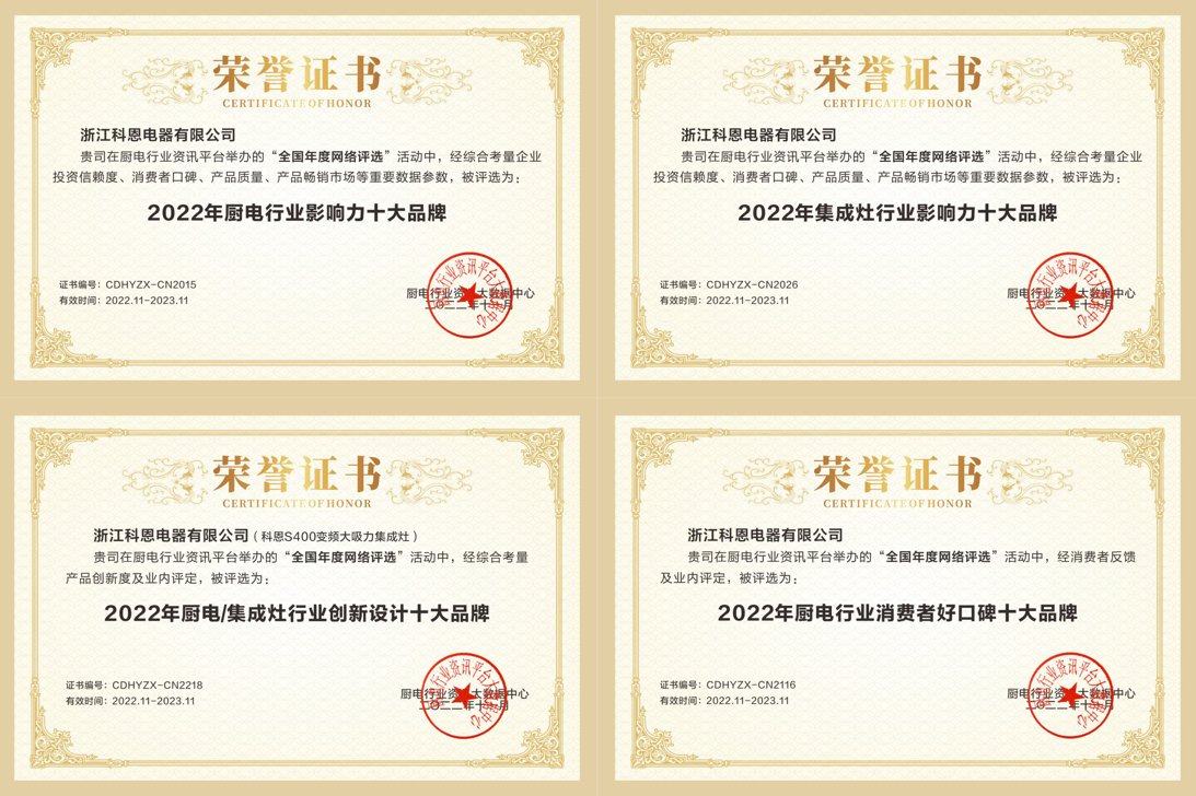 2022年是科恩電器收獲的一年,在榮譽(yù)榜單中脫穎而出,包攬行業(yè)眾多大獎(jiǎng),是對(duì)科恩獨(dú)一無(wú)二品質(zhì)的認(rèn)可。未來(lái),科恩將載譽(yù)前行,繼續(xù)在制造、產(chǎn)品、營(yíng)銷、服務(wù)上扎穩(wěn)根基,堅(jiān)守為消費(fèi)者和經(jīng)銷商做好一系列服務(wù),不斷創(chuàng)新產(chǎn)品、優(yōu)化品牌,綻放更耀眼的光芒,在行業(yè)蓬勃發(fā)展中留下濃墨重彩的一筆。
