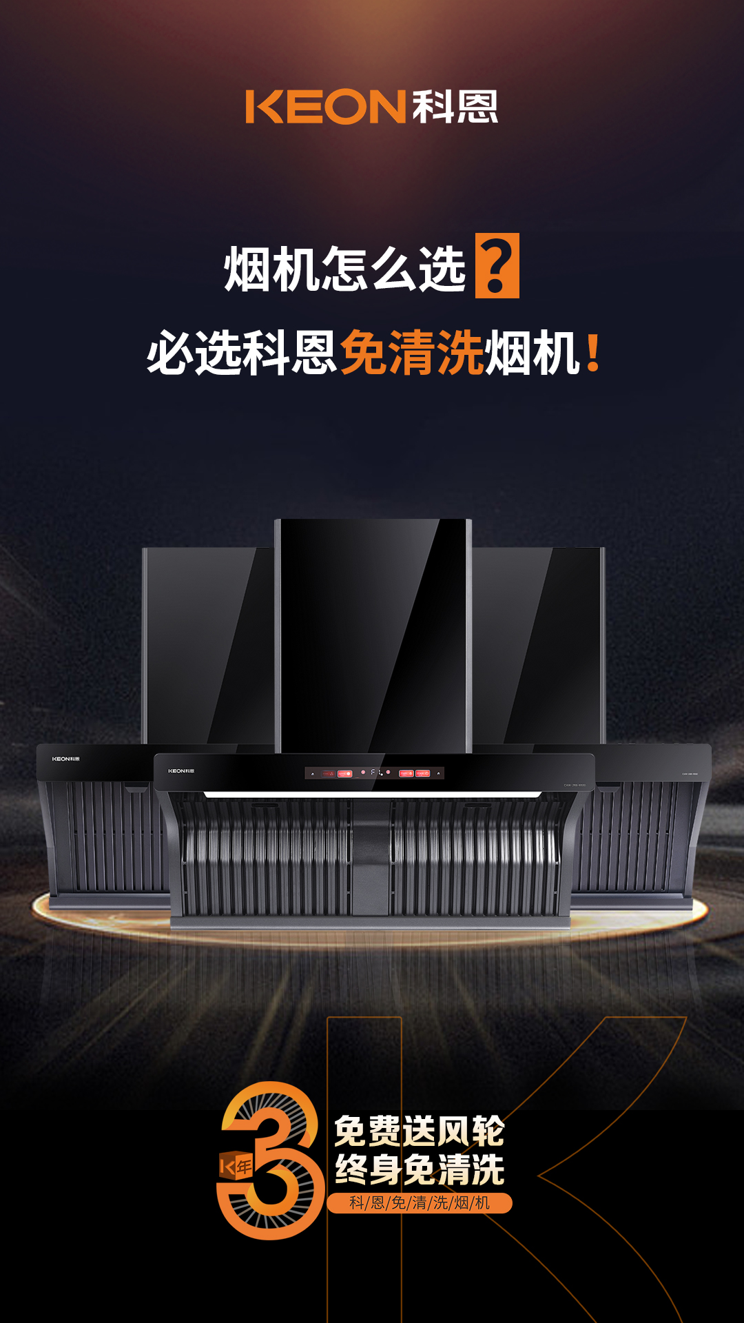科恩電器行業(yè)率先提出3年免費送風輪服務,徹底解決殘余油脂油污問題,真正實現(xiàn)煙機終身免清洗!