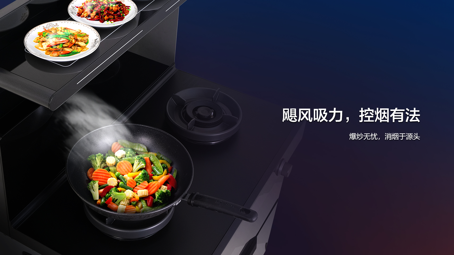 爆炒隨之而來的就是油煙問題,Q1黃金吸煙角搭配颶風(fēng)大吸力,完美解決廚房油煙難題。