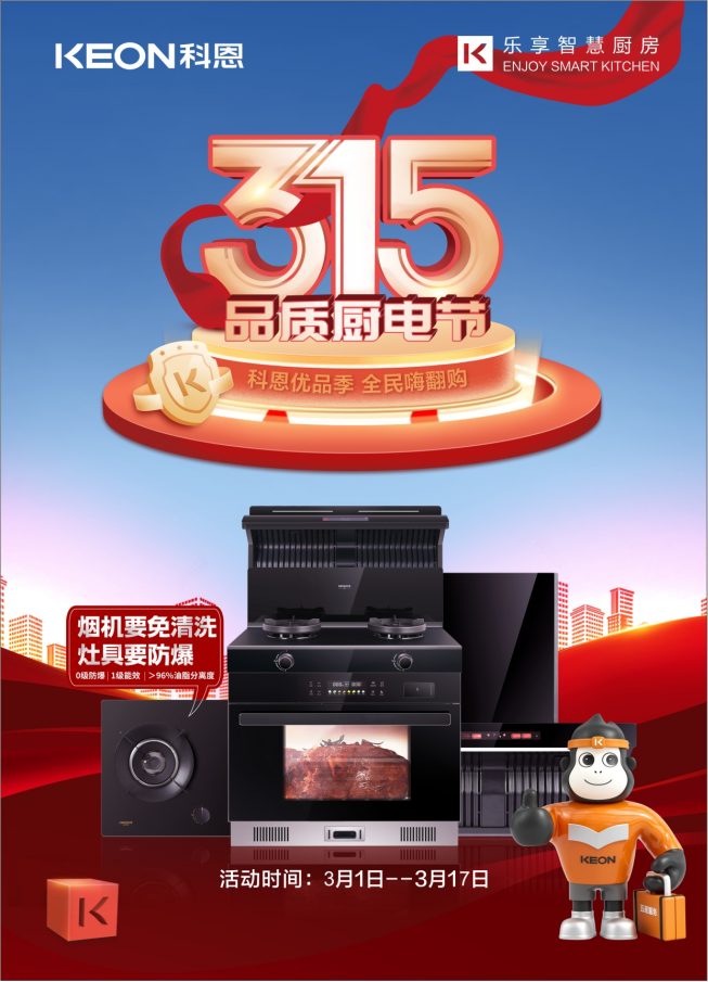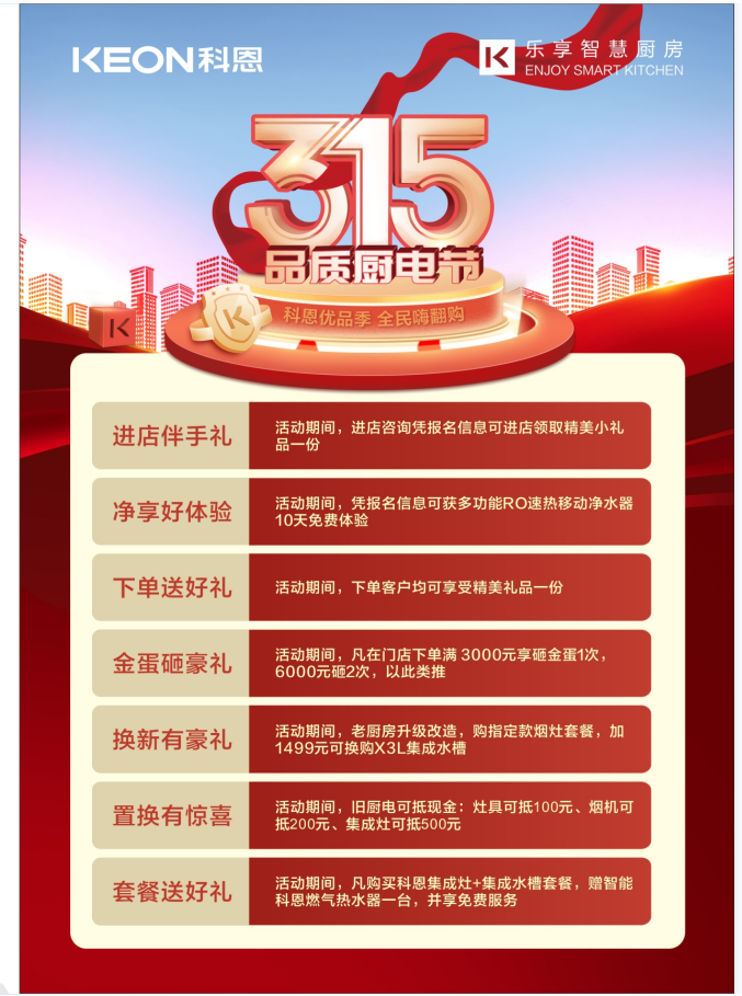 科恩315品質廚電節(jié)”正在火熱進行中,全國千城萬店齊獻7重好禮,只為帶給您全新高品質廚房生活。