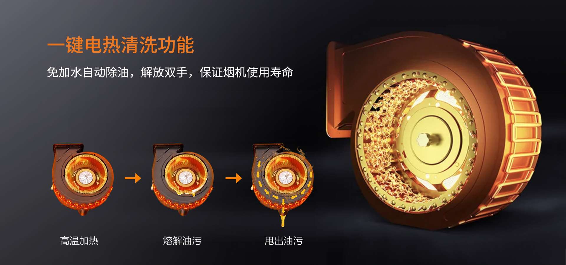 對于煙機(jī)清洗一直以來都被稱為廚房最強(qiáng)“洗”事,科恩T71采用一鍵電加熱清洗,無需拆卸,只需一鍵啟動就可將渦殼上的電加熱膜進(jìn)行加熱,通過油垢溶解流出的方式來清理煙機(jī)內(nèi)部,同時,渦殼內(nèi)的高溫還可使風(fēng)輪上的油垢軟化,隨著風(fēng)輪的轉(zhuǎn)動將油垢甩出。