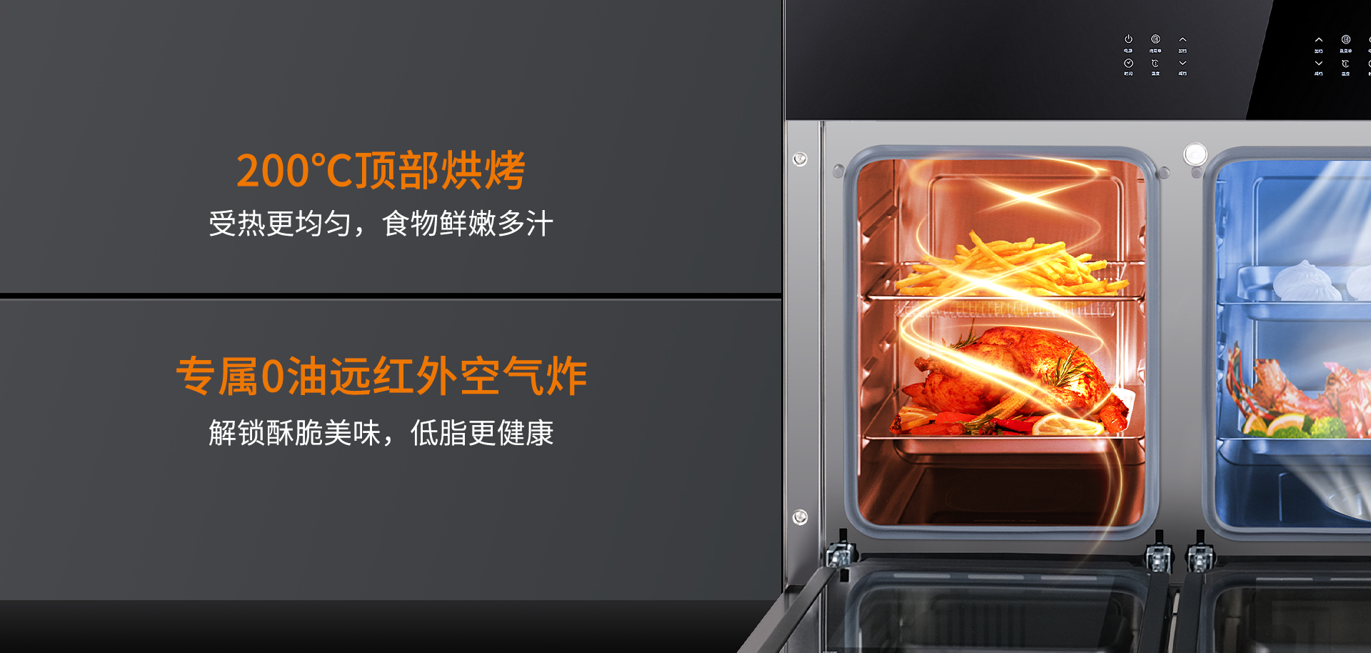 S450L采用200℃頂部烘烤,讓食材受熱更均勻,保障食材鮮嫩多汁,烤的有滋有味!同時,還配有0油遠(yuǎn)紅外空氣炸,無油更健康,解鎖酥脆美味。