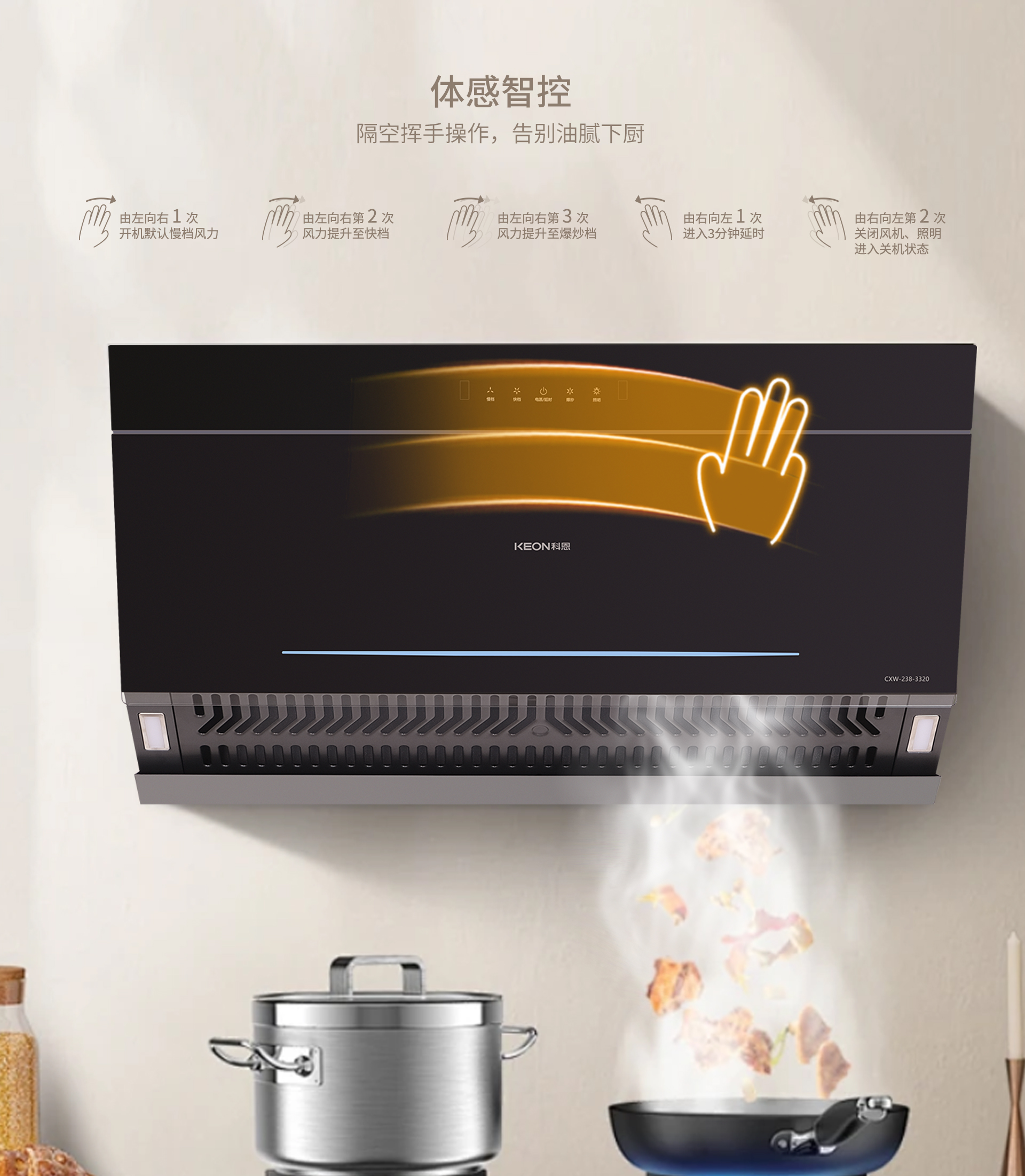 同時,3320采用風機下置,無圍板,可隨心安裝。這種獨特的設計使得安裝過程變得極為便捷,不受圍板的限制,能夠根據廚房的布局和個人需求自由選擇安裝位置,真正實現(xiàn)隨心所。