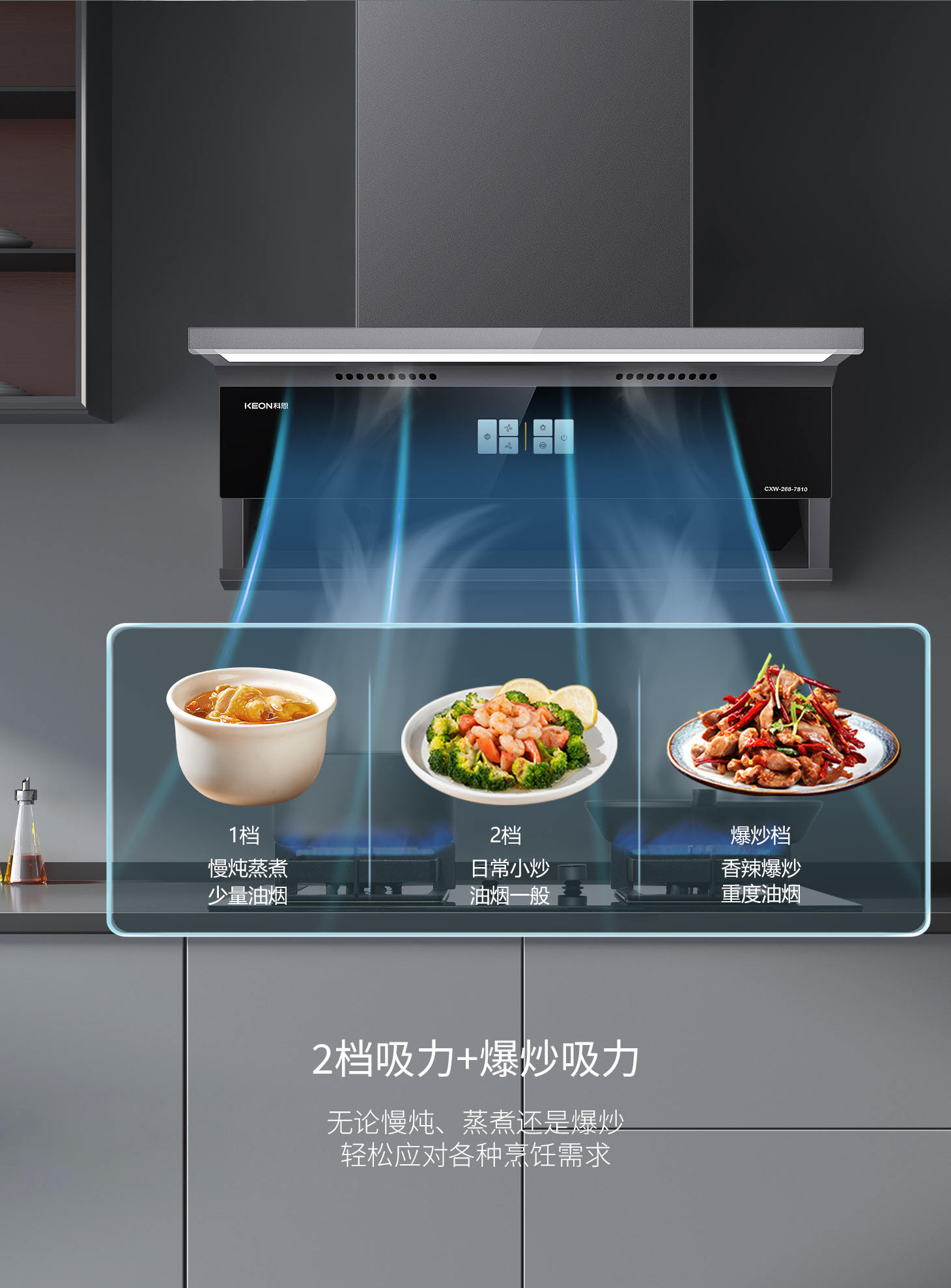 科恩旗艦款大吸力油煙機(jī)7810,兩檔吸力+爆炒模式,輕松下廚零負(fù)擔(dān)。智能自清洗去除頑固油污,延時(shí)凈煙自動(dòng)清除余味,守護(hù)廚房每一寸清新。攜手科恩,煥新生活。科恩7810凈煙有魄力,廚房方寸皆自由。這個(gè)舊廚煥新季,換一臺(tái)會(huì)思考的煙機(jī),給廚房一次溫柔革命!