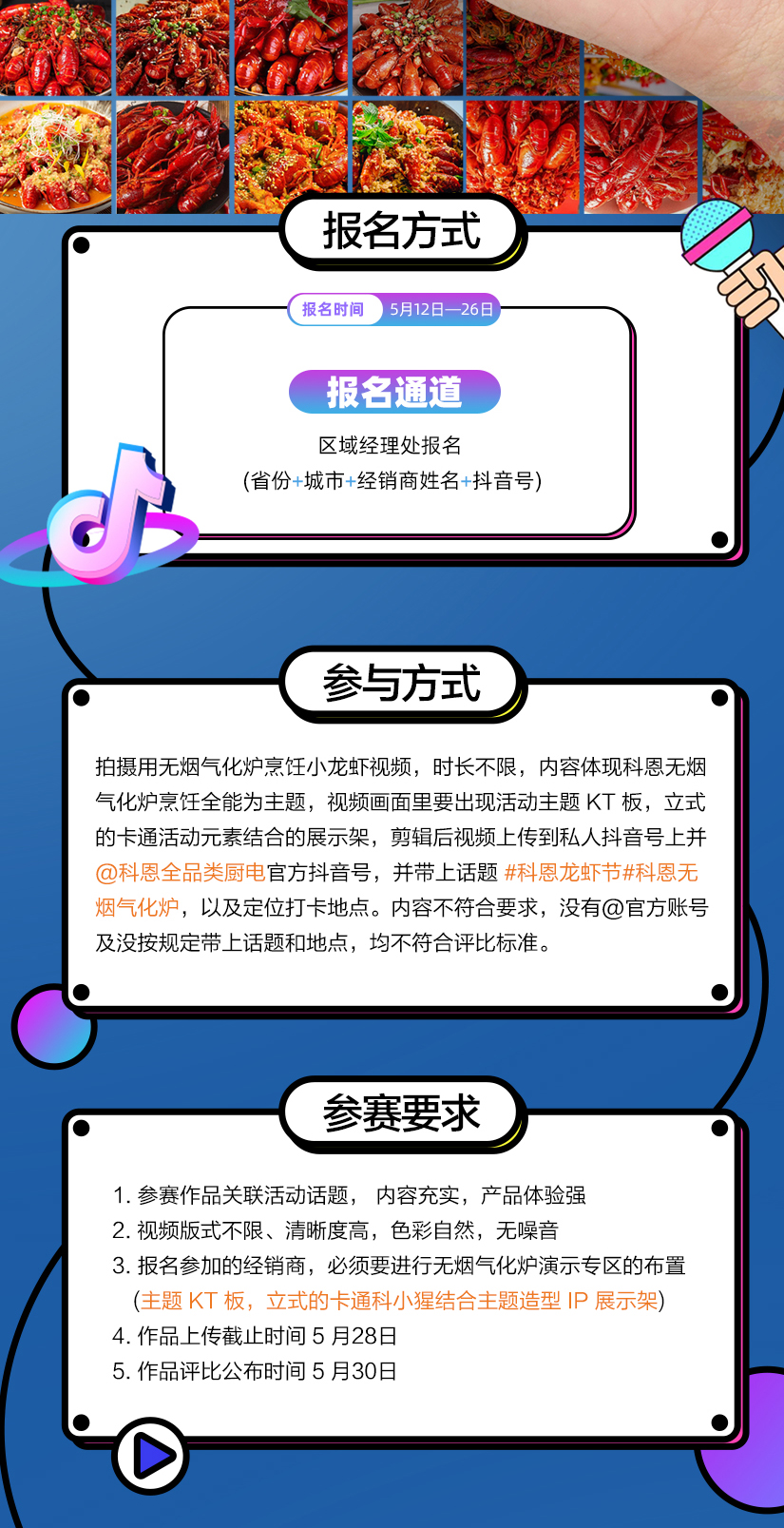 五月的煙火氣,藏在小龍蝦肥美的蝦鉗里,藏在氣化爐的勁焰猛火中,爐力全開,鉗動(dòng)江湖。5 月12日——5月26日,一場舌尖與視覺的雙重盛宴拉開序幕!科恩龍蝦節(jié)抖音短視頻PK大賽重磅來襲,誠邀全國科恩專賣店,共赴這場創(chuàng)意與實(shí)力的較量,用鏡頭記錄無煙料理的無限可能。