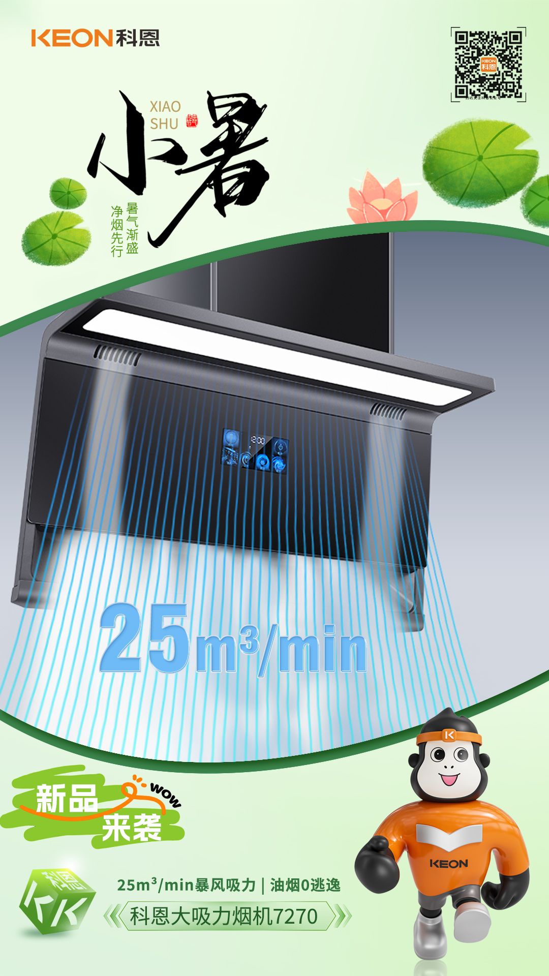 蟬鳴初起,熱浪翻涌。小暑時節(jié)廚房成高溫重災(zāi)區(qū),油煙升騰中包裹著暑氣更顯煩躁,科恩7270煙機(jī)攜25m³/min暴風(fēng)吸力來襲,為廚房筑起清涼防線,讓凈煙快一步,生活慢享受。