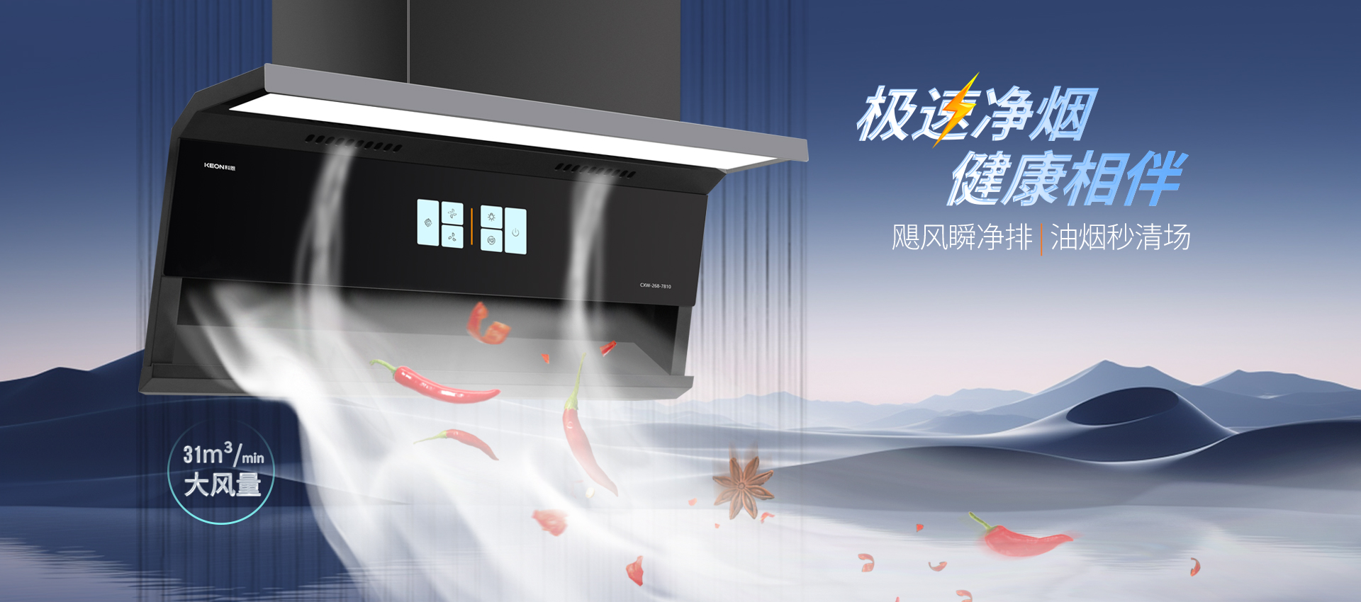 空間煥新,凈美廚房。舊煙機笨重占空間難適配,換新品怕拆櫥柜,2.5cm輕薄機身解你顧慮,冰川灰鑲邊適配風格,天鵝頸上仰設計釋放空間,烹飪操作從容坦蕩。爆炒濃煙,瞬吸凈場辣椒入鍋油煙瞬間升騰,開放式廚房全家遭煙熏”, 31m³/min大風量強勢捕獲1350Pa變頻風壓破擁堵,高峰時段排煙依舊順暢,清新空氣常駐烹飪時光。全域攏煙,無隙可逃。吸力再大跑煙也枉然895mm寬域控煙筑屏障,負壓內(nèi)傾設計順勢直排頂吸側(cè)吸協(xié)同發(fā)力,下層攏煙上層阻逃逸,輕重油煙全被精準鎖定。