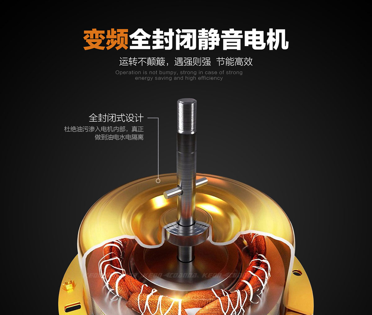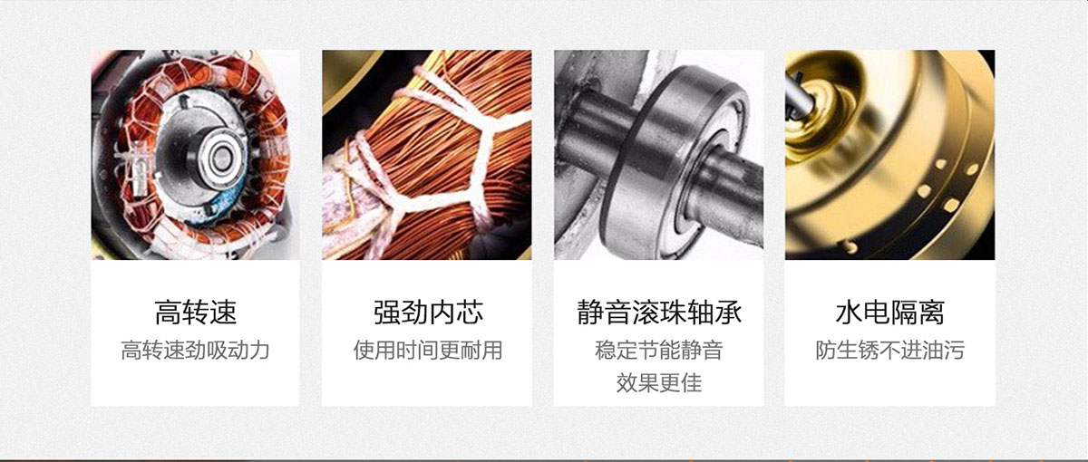 • 全封閉雙滾珠靜音電機,高速運轉不顛簸,高效耐用,防銹耐污。