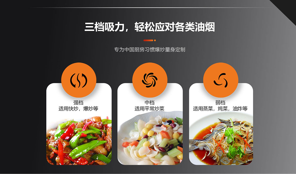 • 三檔吸力,輕松應(yīng)對各類油煙,專為中國廚房習(xí)慣爆炒量身定制