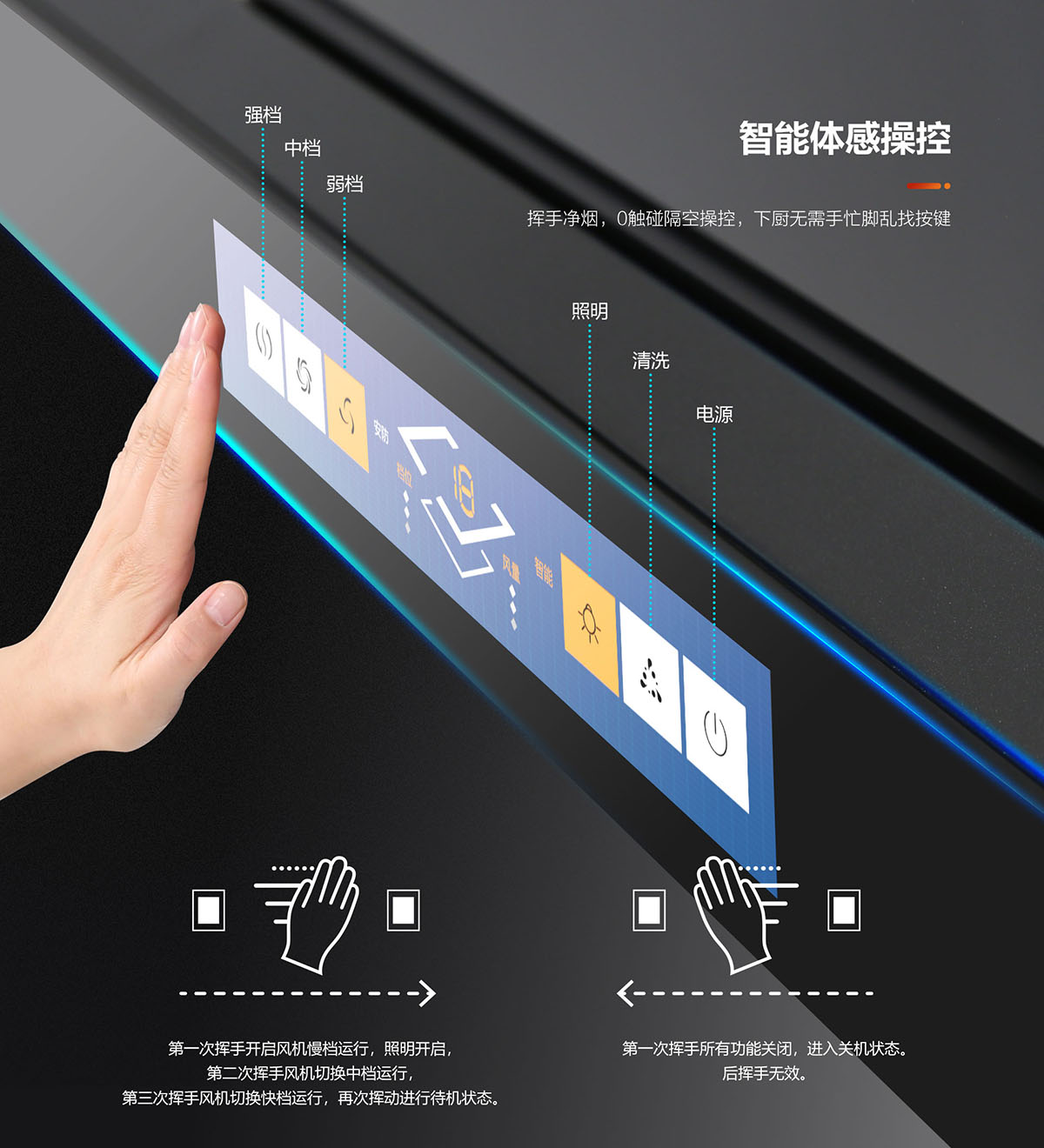 • 智能體感操控,揮手凈煙,0觸碰隔空操控,下廚無需手忙腳亂找按鍵