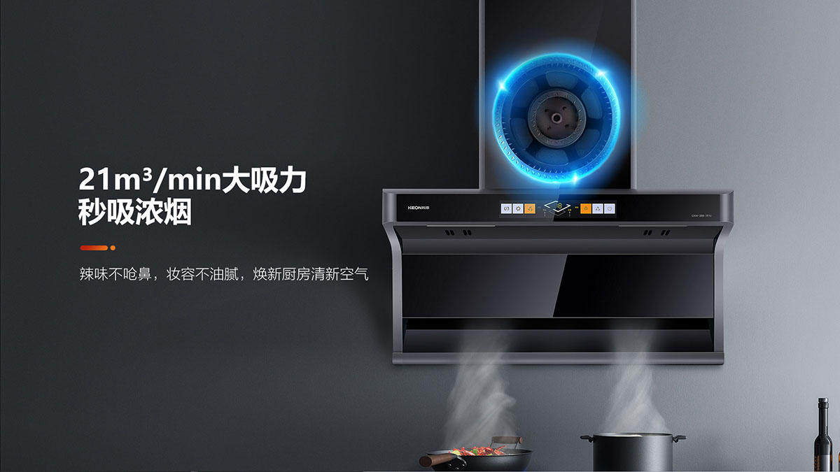• 21m3/min颶風(fēng)吸力,瞬吸濃煙,辣味不嗆鼻,煥新廚房清新空氣