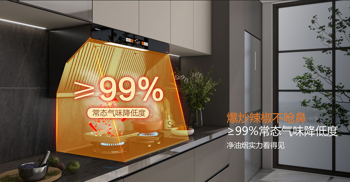 - 颶風大吸力,≥99%常態(tài)氣味降低度,爆炒辣椒不嗆鼻