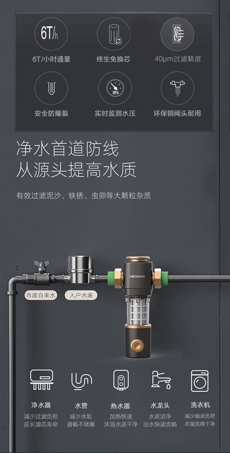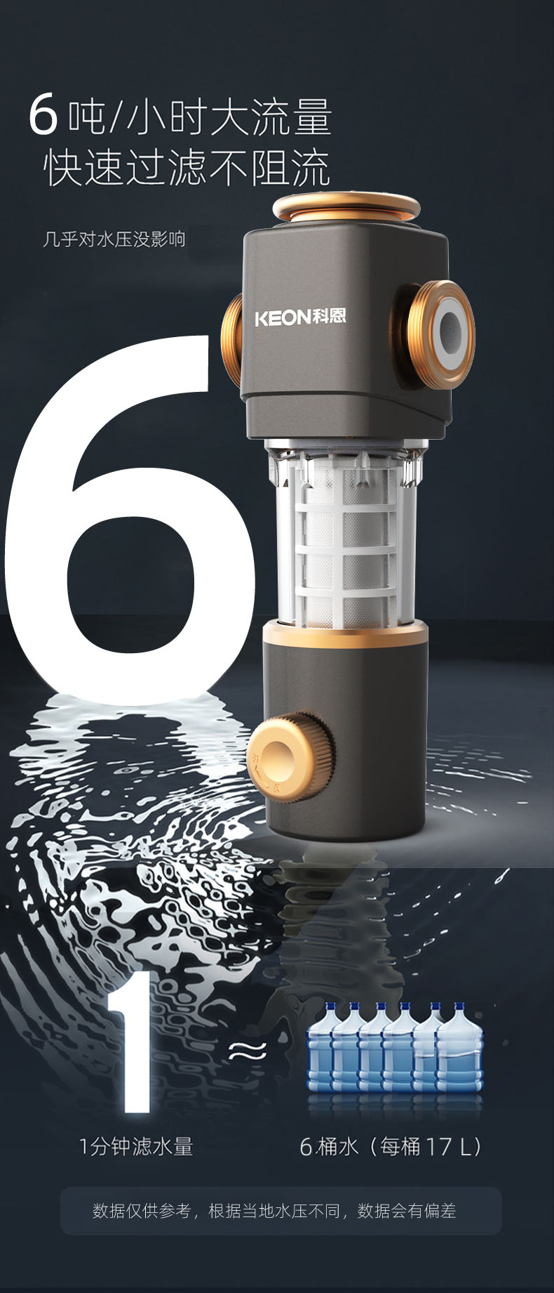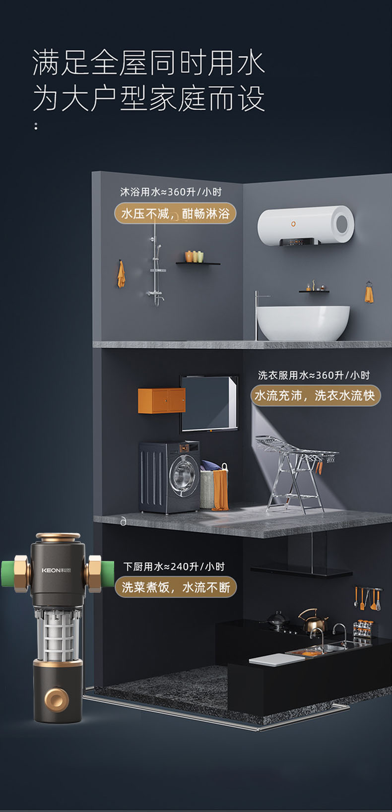 • 6噸/小時大流量,快速過濾,全屋用水無壓力