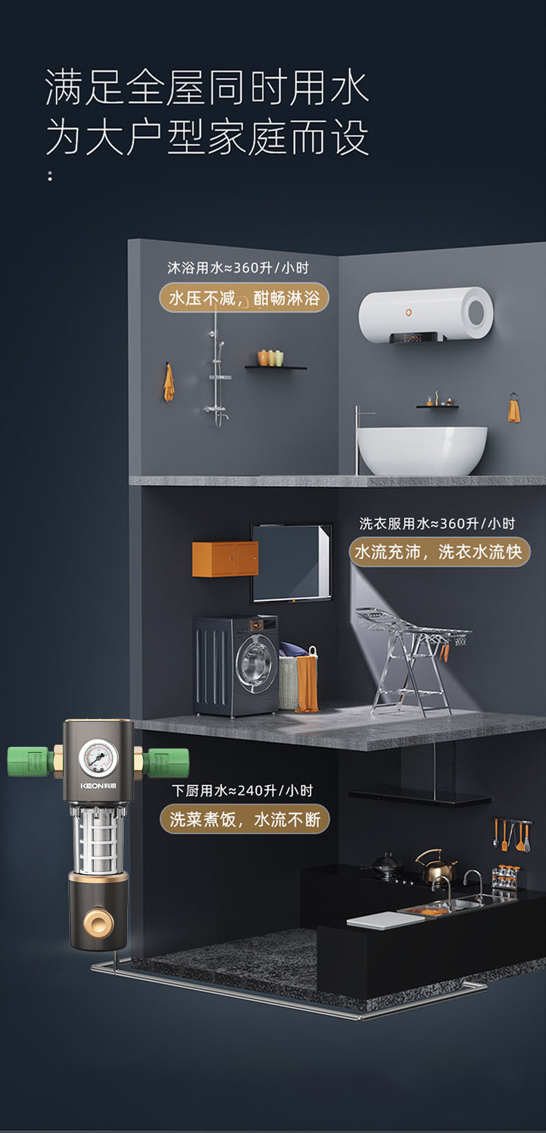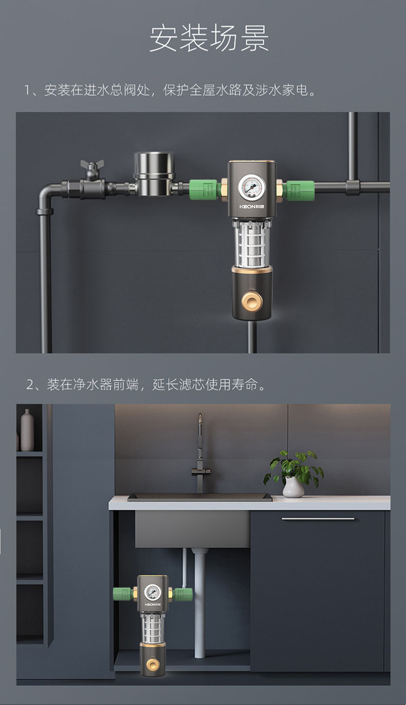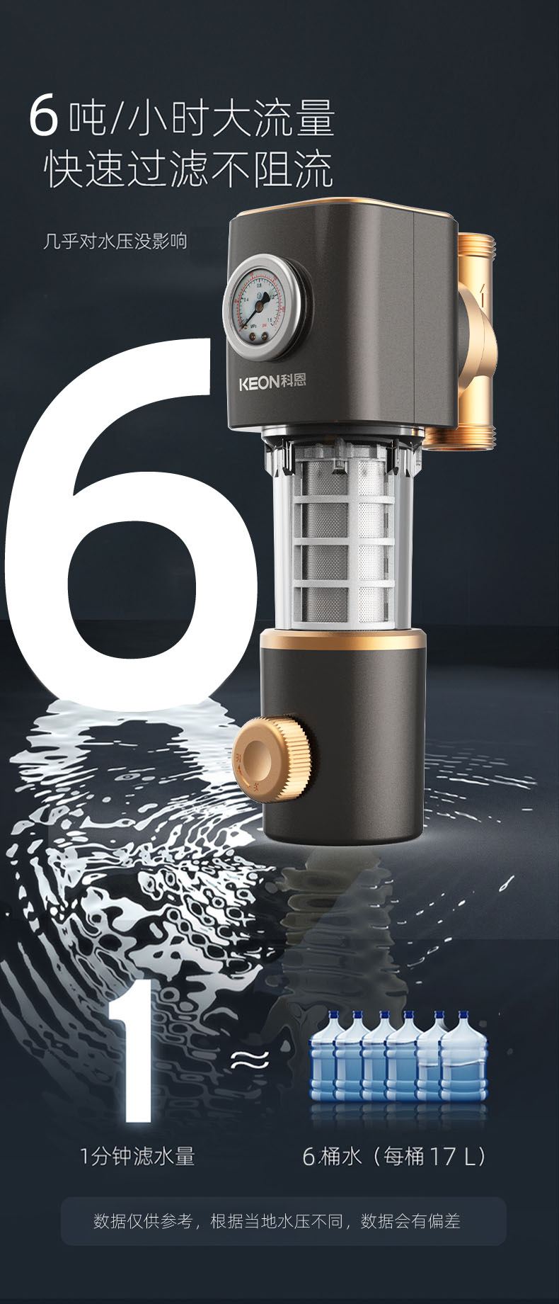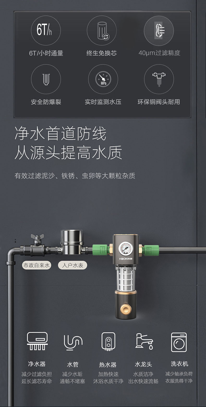 • 6噸/小時(shí)大流量,快速過濾,全屋用水無壓力