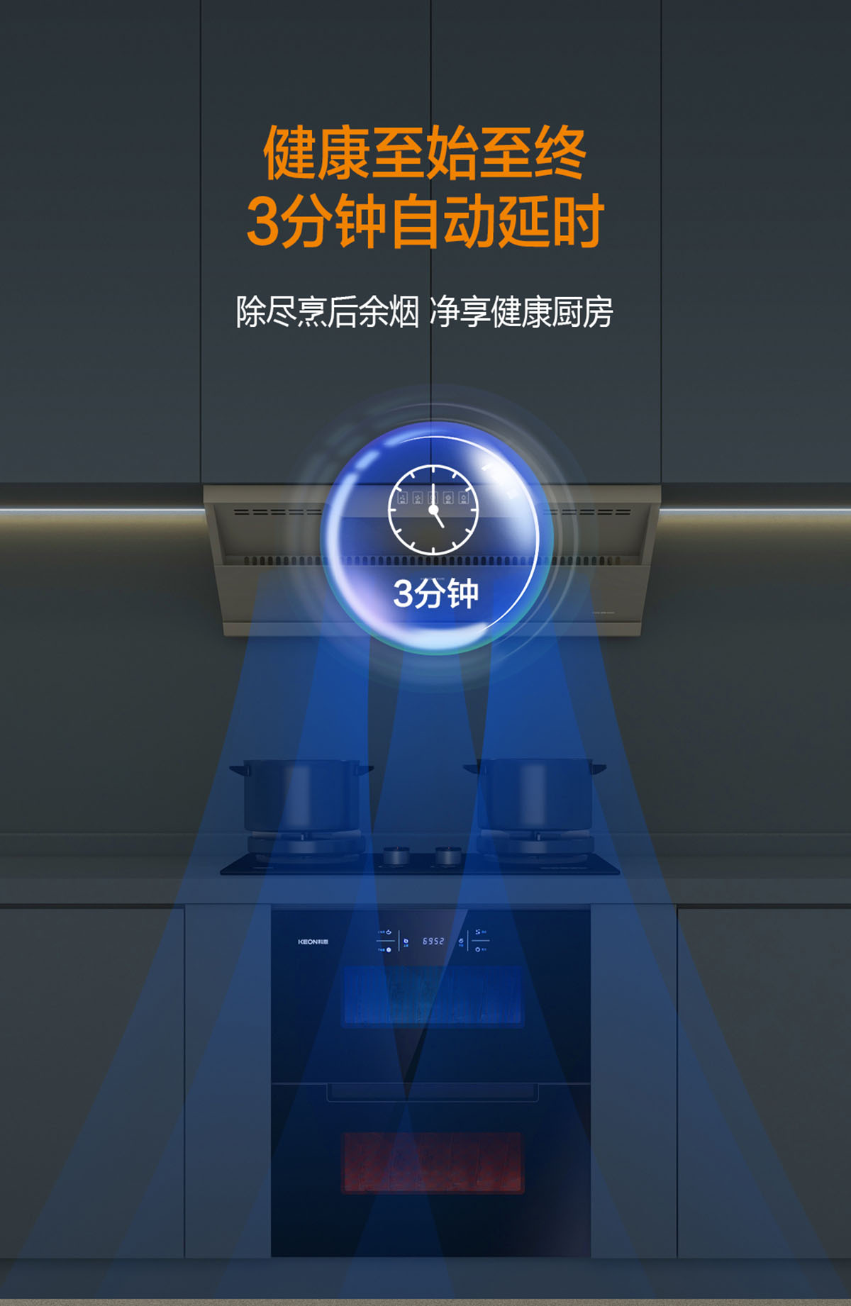 • 健康至始至終,3分鐘自動延時,除盡烹后余煙