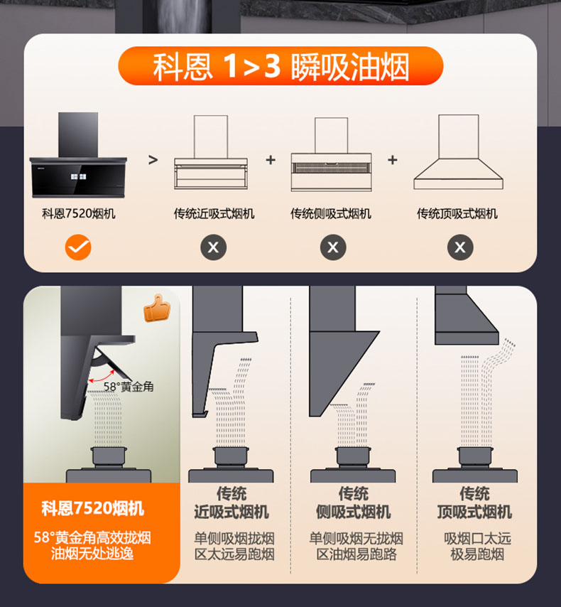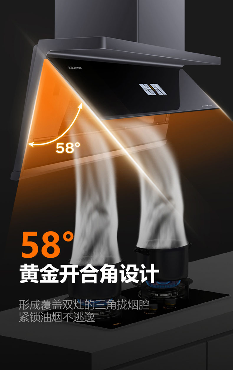 - 采用58°黃金開(kāi)合角,緊鎖油煙不逃逸